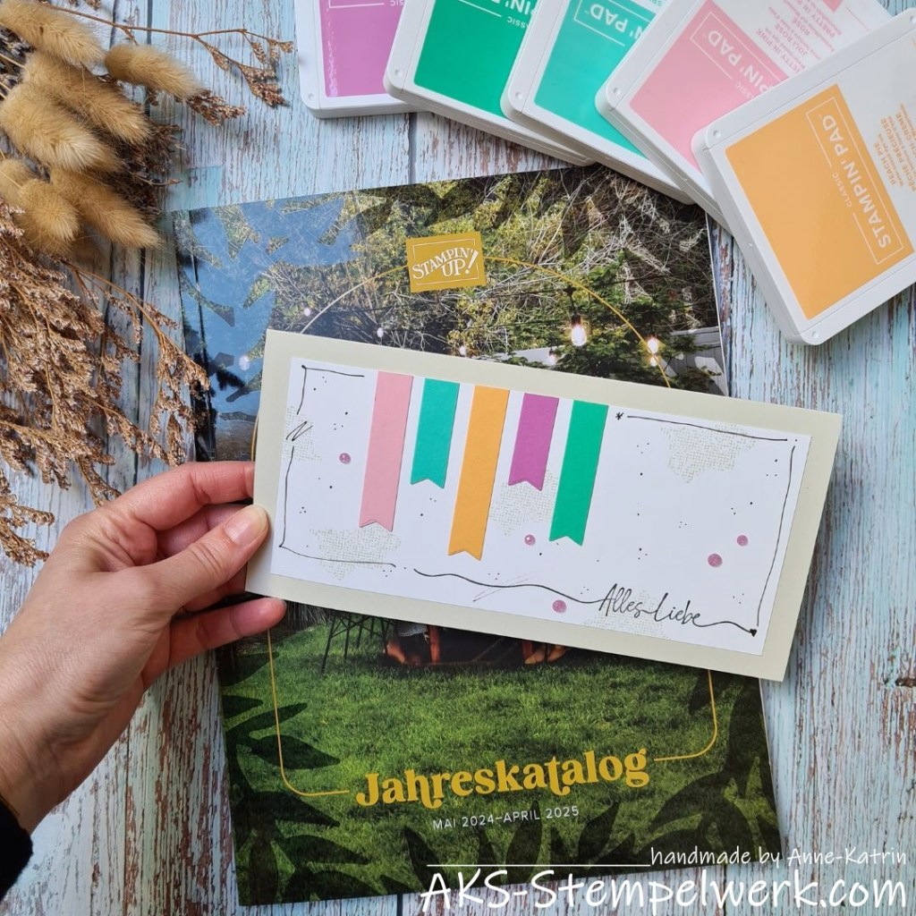 Die Fähnchen habe ich übrigens mit einer Form aus dem neuen Set „Stanzformen Kuschelgrüße“ (Hauptkatalog S. 61) gemacht. Bei dem Set ist der Name wirklich Programm. Vesprochen. Aber dazu dann demnächst mehr…