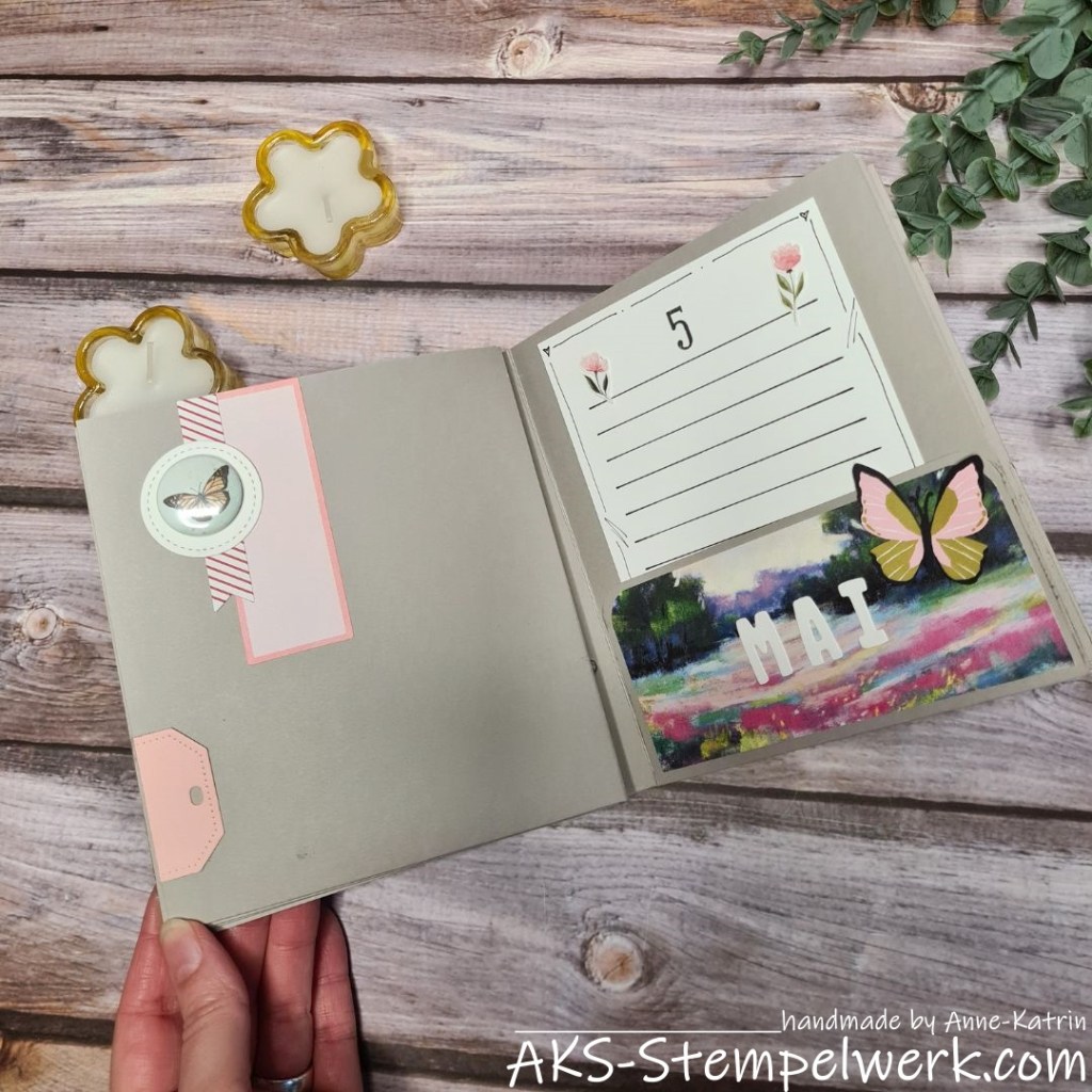 Die Schmetterlinge auf den April- und Mai-Seiten und die Fähnchen und Etiketten im Mai findet Ihr demnächst im neuen Jahreskatalog. Sie gehören zur „Mix und Match-Reihe“