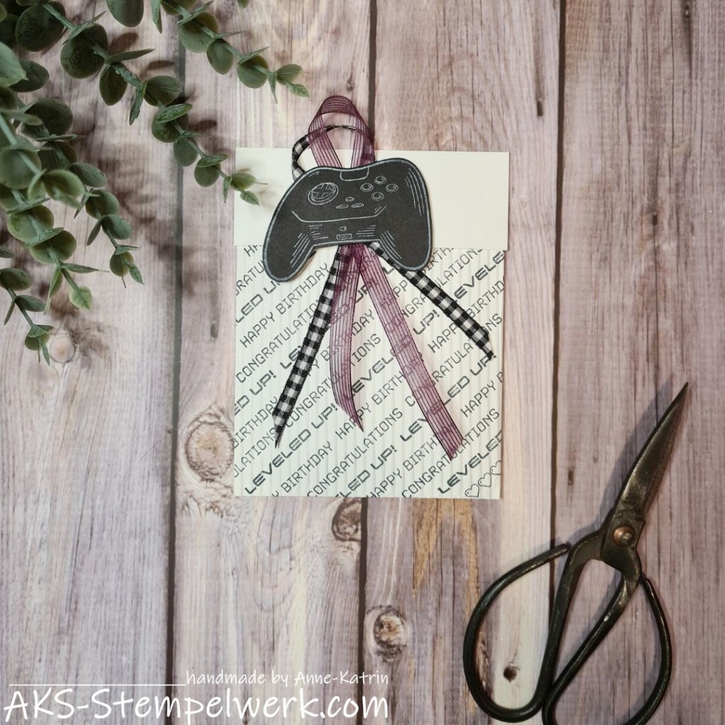 Jetzt habe ich ganz ad hoc noch eine kleine Geburtstagsverpackung für Euch, bei der das Stempelset „Level complete“ zum Einsatz gekommen ist.