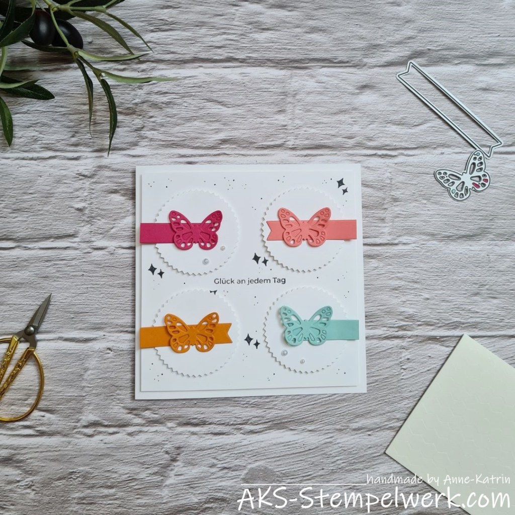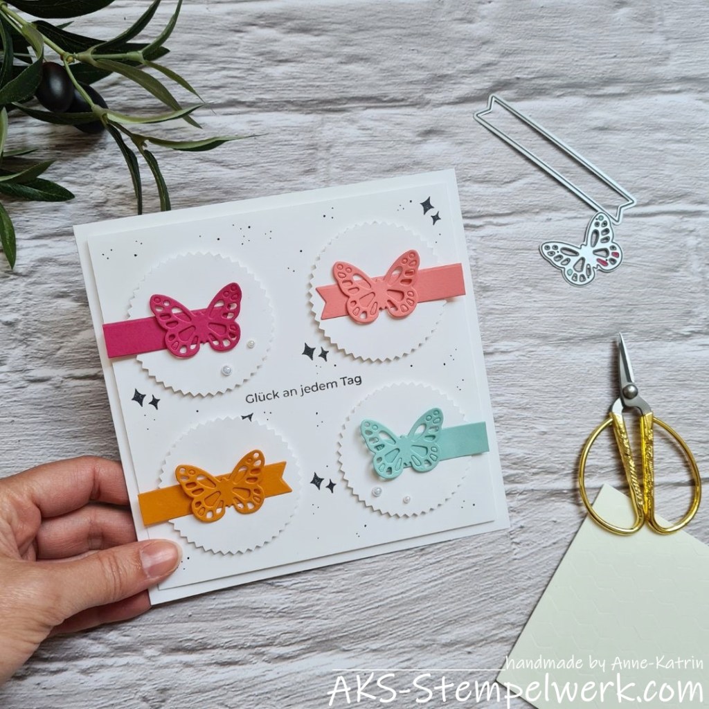 Ich wollte unbedingt mit Schmetterlingen arbeiten. Nach gefühlten Jahren Pause, sind die ja in diesem neuen Jahreskatalog wieder sehr üppig vertreten, z. B. in dem Produktpaket „Sketched Butterflies“. Das freut mich sehr und aus der Idee im Kopf ist „in echt“ dann Folgendes entstanden: