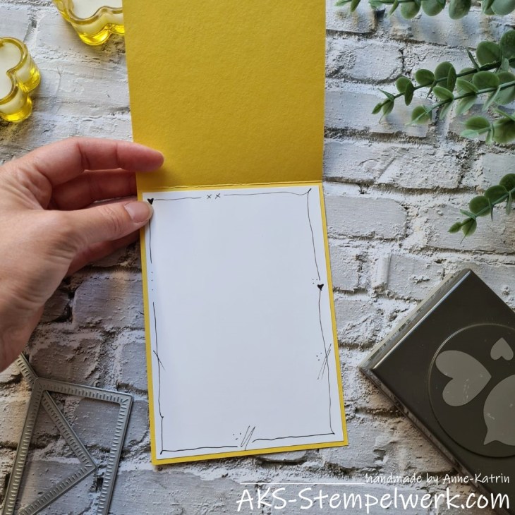 Da ich nicht gerne auf farbigem Papier oder Karton schreibe, habe ich innen noch einen weißen Aufleger eingeklebt und etwas gedoodelt.