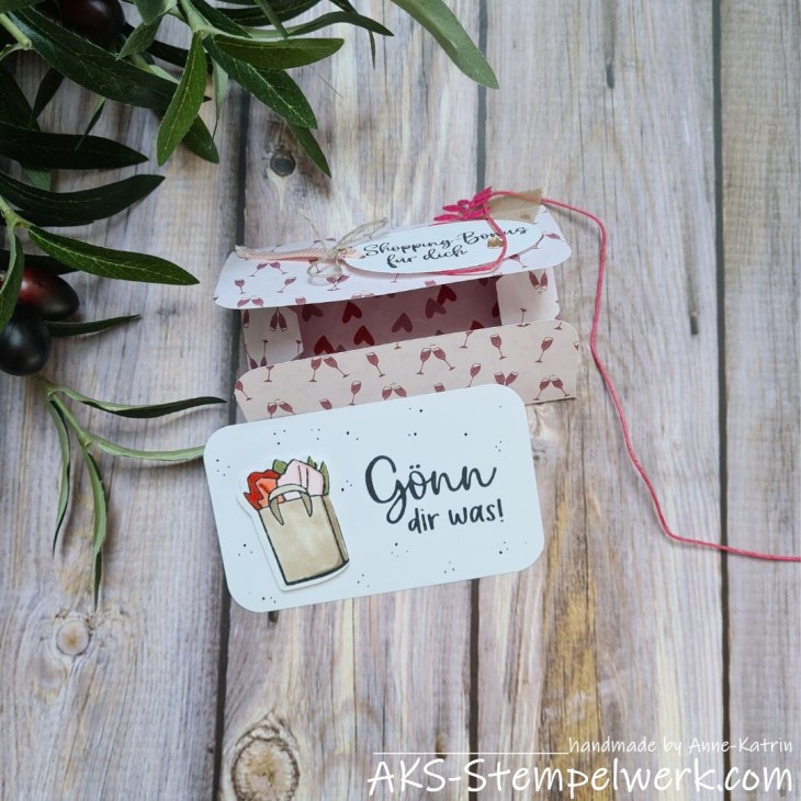 Ebenfalls bestempelt mit dem Set „In Kauflaune“, ausgestanzt und coloriert mit den Stampin‘ Blends.