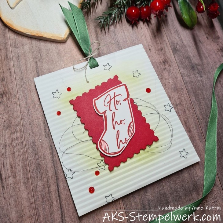 „Festliche Worte“ heißt das Stempelset mit dem schönen Weihnachtsstiefel. Der ist schnell per Hand ausgeschnipptelt und mit Dimensionals auf die Briefmarkenstanzform aus dem Set „Bezaubernde Botschaften“ aufgebracht. Beides übrigens in glutrot.