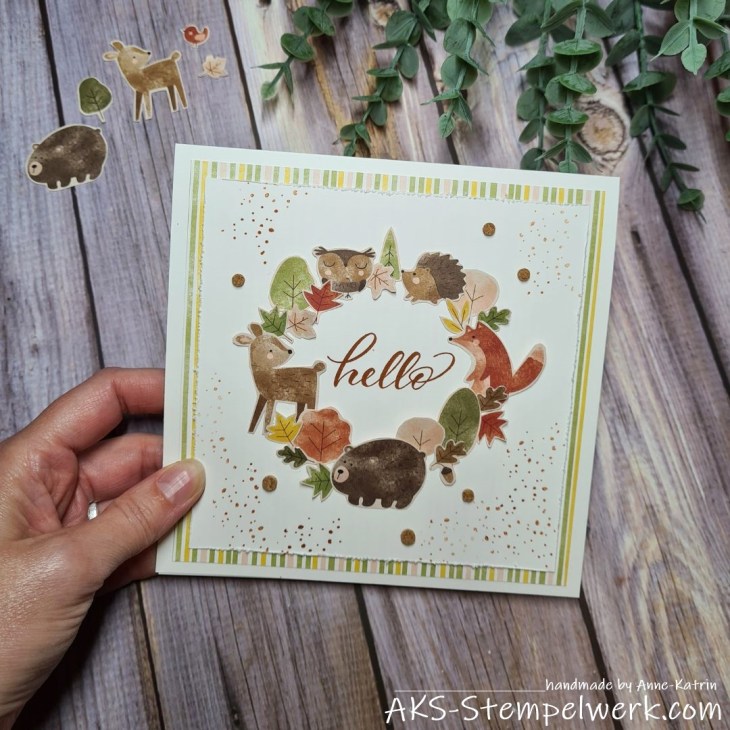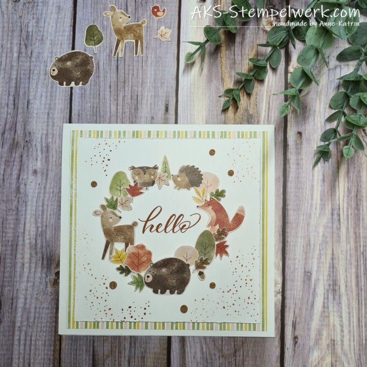 …und ein paar der süßen Tierchen aus dem Designerpapier „Schöne Herbsttage“ ausgeschnitten, um diese quadratische Herbstkarte zu werkeln. 😇