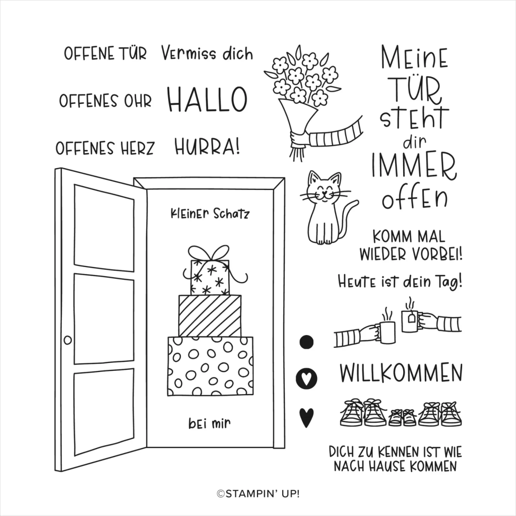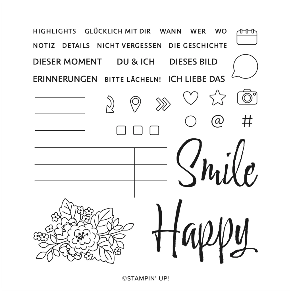 Die Punkte und Sterne für den Hintergrund findet Ihr in den Sets „Willkommen“ und „Glückliche Momente“. Gerade diese kleinen süßen Stempelchen übersieht man ganz oft, aber die sind manchmal das I-Tüpfelchen.