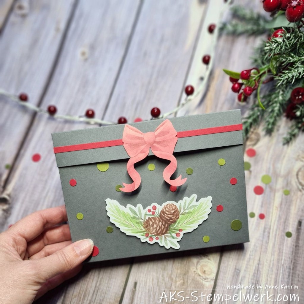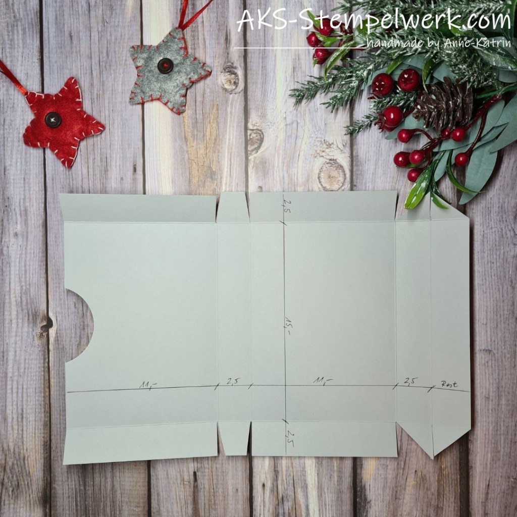 Für die Box habe ich 1 Bogen Farbkarton in anthrazit gewählt und bei der Verzierung habe ich dann ganz auf rot und grün gesetzt. 🙂