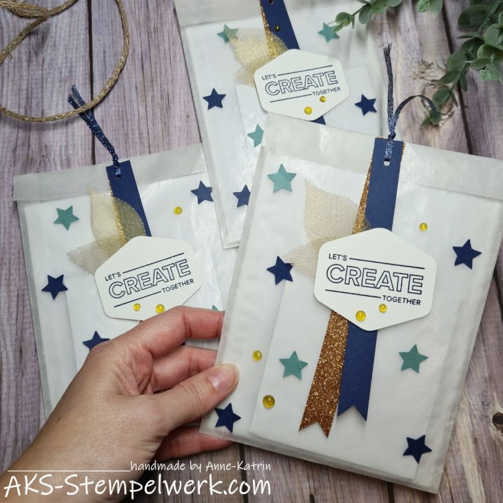 Der Spruch stammt aus dem Set „Let’s create together“… ich glaube das war mal ein Demonstrator-Stempelset… und ausgestanzt habe ich mit der Handstanze „Hexagone von Herzen“, eine sehr vielseitig einsetzbare Stanzform, die ich sehr mag.