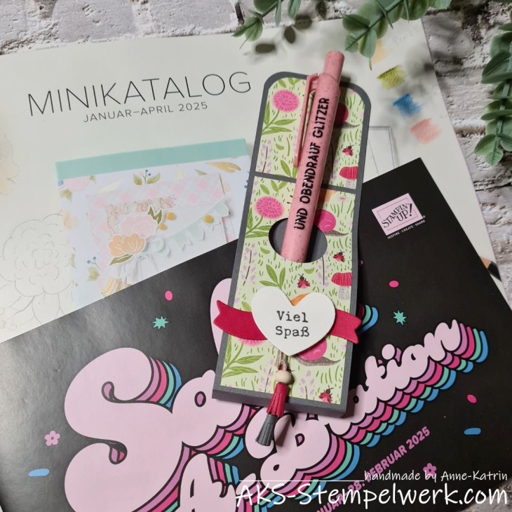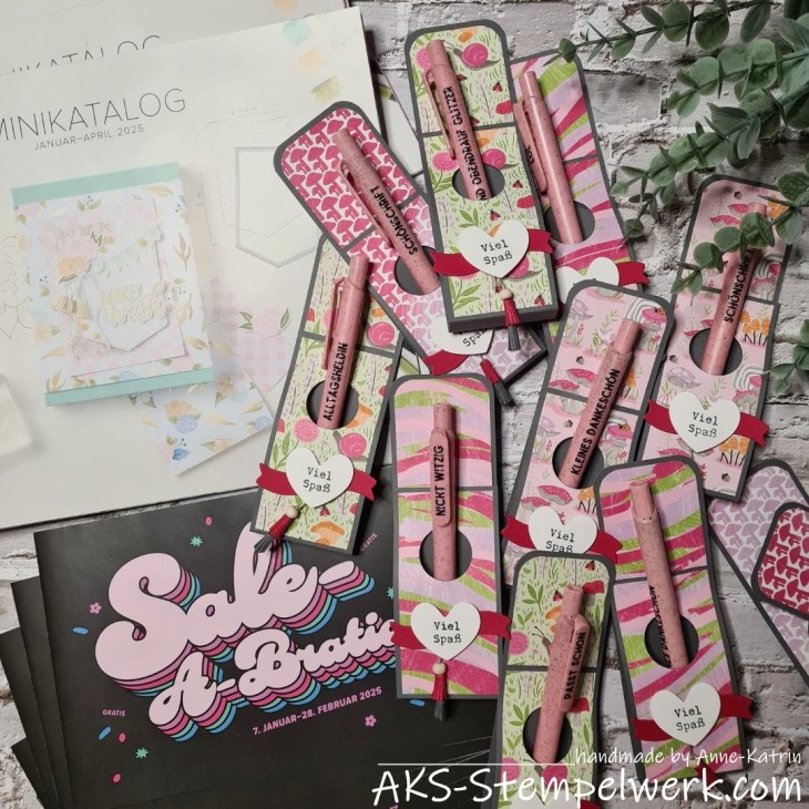 Als Kataloggoodies habe ich Kugelschreiber mit kleinen Rub On-Sprüchen verziert und eine entsprechende Verpackung dafür gewerkelt.