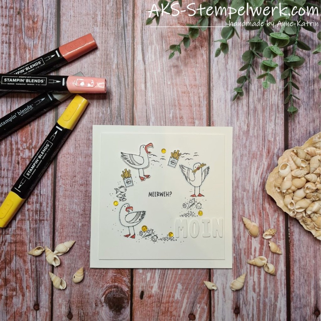 Auch der Spruch in der Mitte stammt aus dem Stempelset und das Moin habe ich mit dem Stanzset „Mini-Alphabet“ ausgestanzt und ebenfalls mit den Dimensionals aufgeklebt.