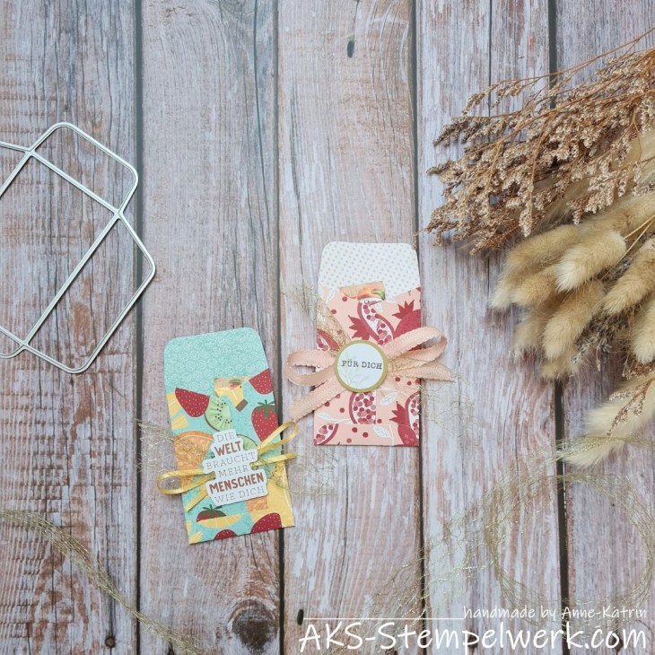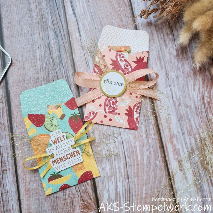Dazu habe ich mir die Umschlagstanzform aus dem Set „Kreative Kräuter“ geschnappt. Die passt auch wieder perfekt auf einen Bogen dieses 6 x 6″-DSP und im Nu sind diese süßen Umschläge gezaubert, die ich dann mit den kleinen FRITTS-Minis gefüllt habe.
