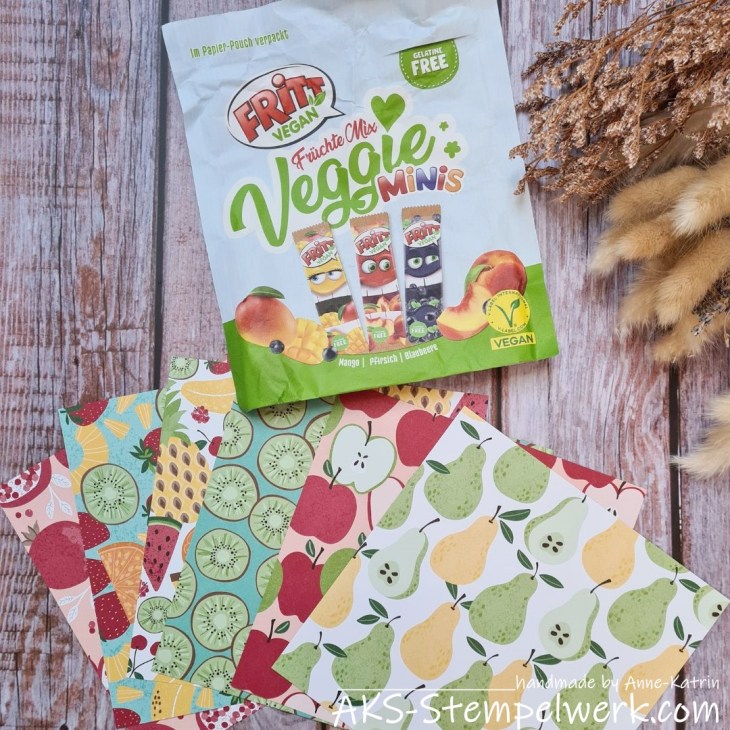 Ich habe mir für heute das SAB-Designerpapier „Früchte Mix“ ausgesucht, und zwar, weil es perfekt zu meiner „Früchte-Mix“-Tüte von FRITT passt.