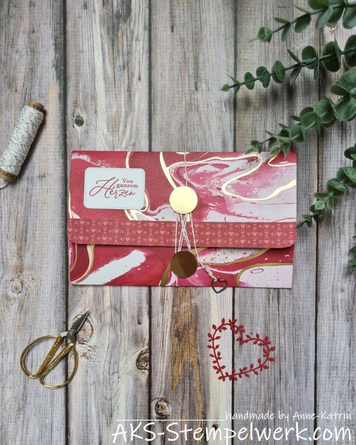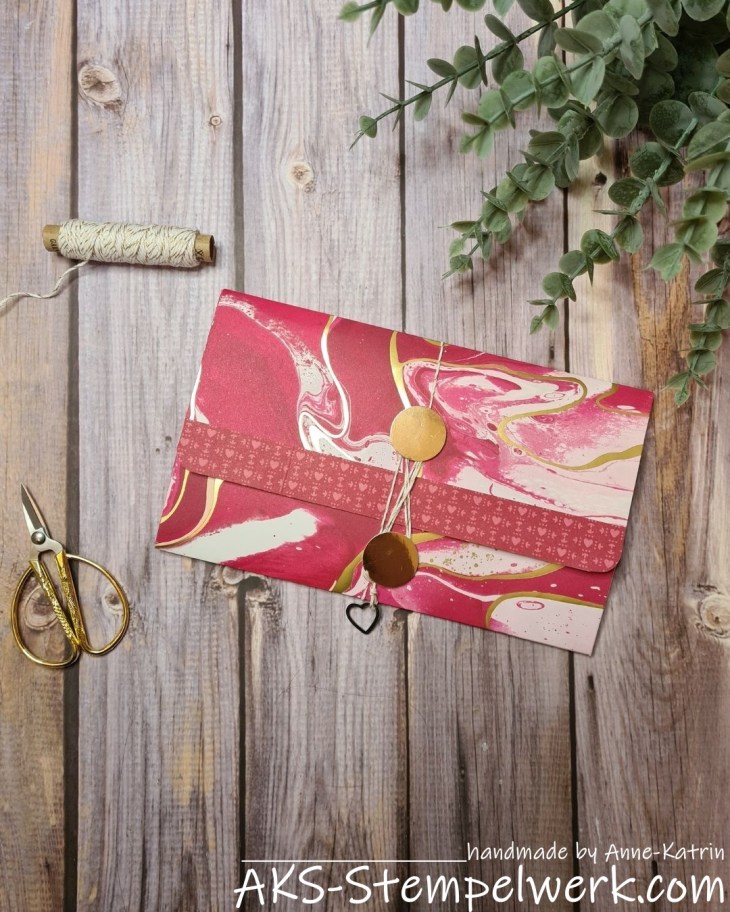 Für den Verschluss habe ich mir eine schöne Kordel gesucht und zwei Kreise aus einer Goldfolie ausgestanzt und mit Dimensionals aufgeklebt.