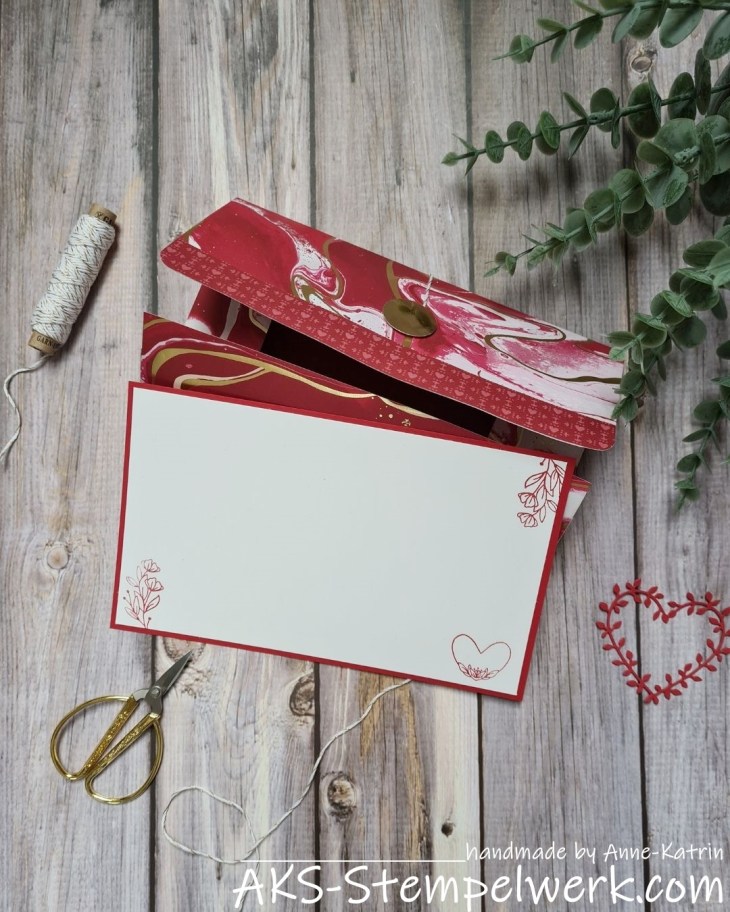 Für das Innenleben habe ich ein Stück Farbkarton zurecht geschnitten in glutrot in 20 x 12 cm und mit einem bestempelten Aufleger in grundweiß mit den Maßen 19,5 x 11,5 cm beklebt.