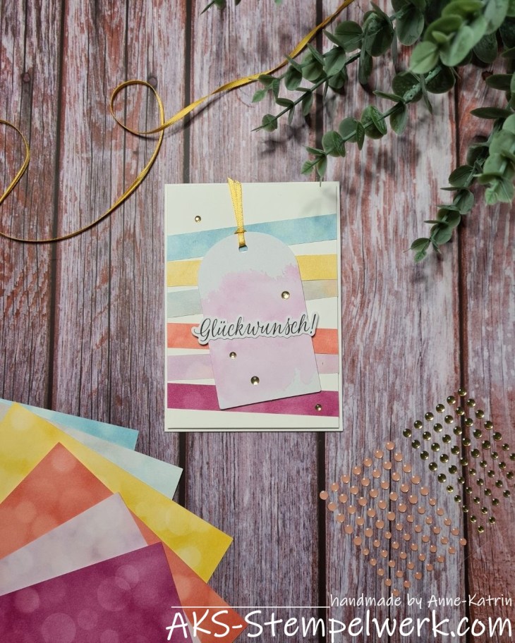 Mein Kartendesign enthält die komplette Farbpalette; von jedem Bogen ist ein Streifen enthalten. Und wie man sieht, würde sich so eine Karte auch wunderbar für eine Resteverwertung anbieten 😉