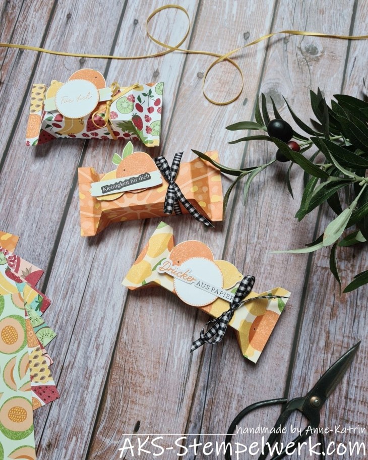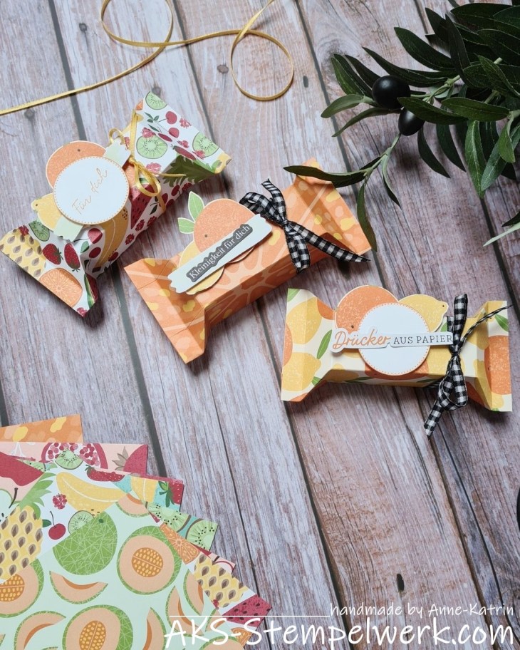 Deshalb habe ich heute noch mal ein paar süße Goodies aus dem SAB-Designerpapier „Früchte-Mix“ für Euch: