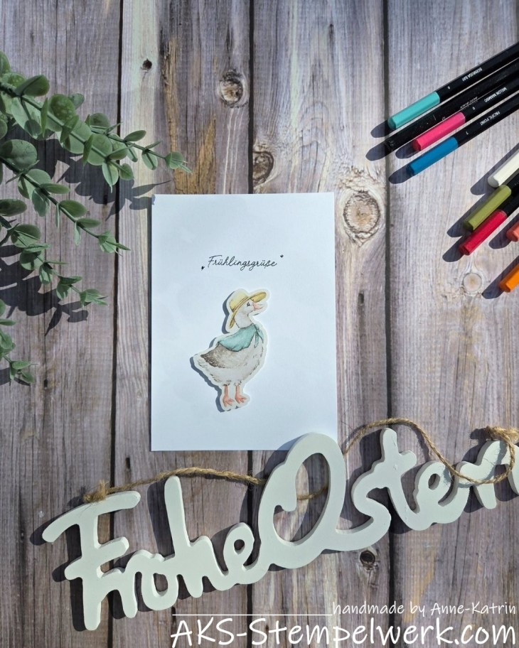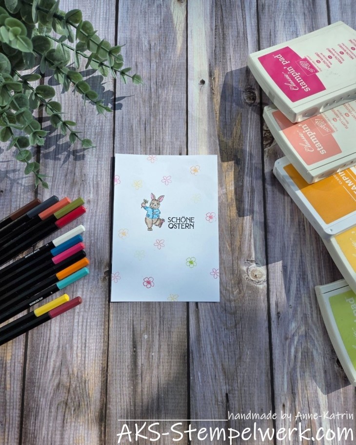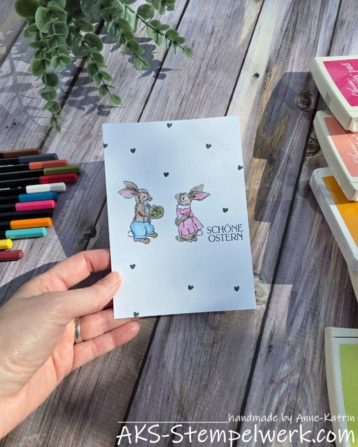 Angefangen hat meine Osterkollektion mit den gestempelten Motiven, die ich dann mit den Aquarell– und Mischstiften coloriert habe.