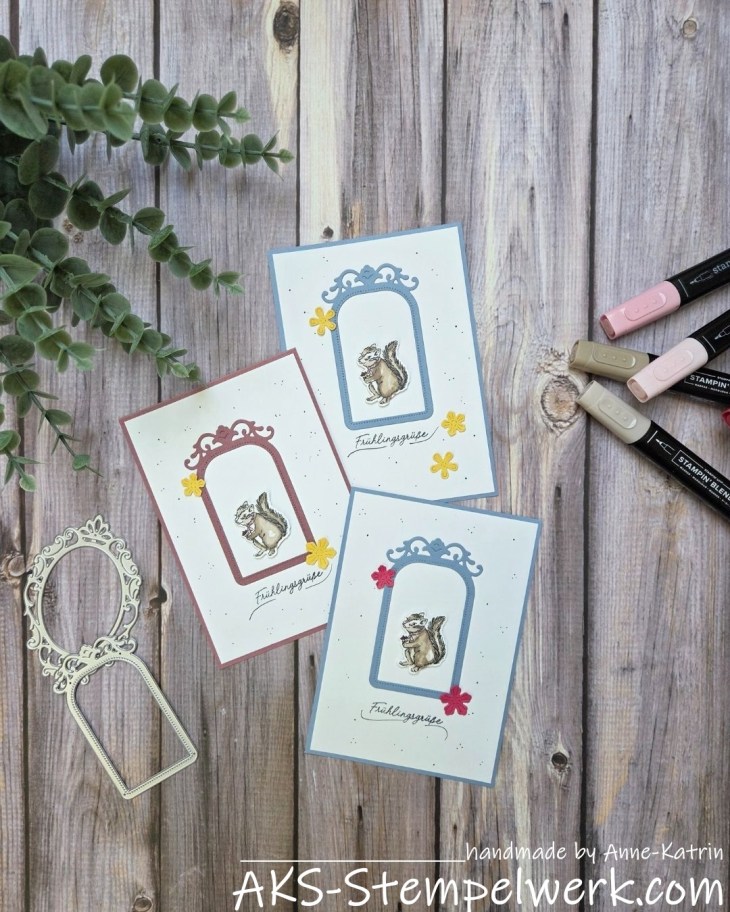 Die süßen Tierstempel habe ich mit den Stampin‘ Blends coloriert und mit den zugehörigen Stanzformen ganz einfach ausgestanzt. Auch die romantischen Rahmen sind in dem Stanzformen-Set enthalten und wirken richtig schön und verspielt.