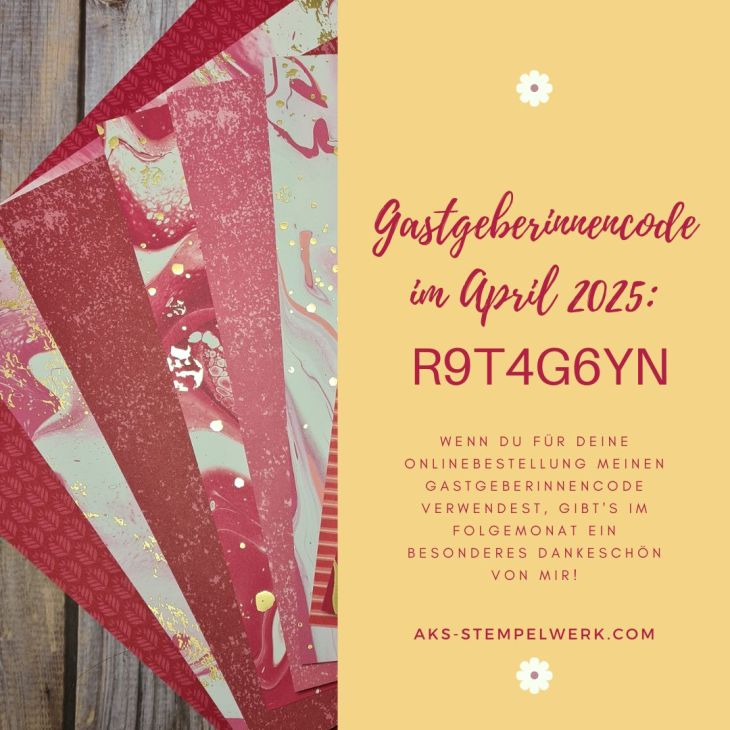 Daher rate ich Euch, direkt online zu bestellen. Verwendet Ihr dafür meinen Gastgeberinnencode für April, erhaltet Ihr als Dankeschön von mir wieder eine besondere Freupost!!!