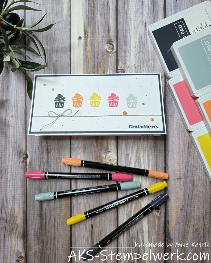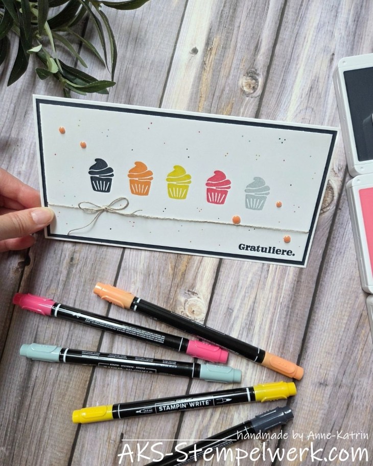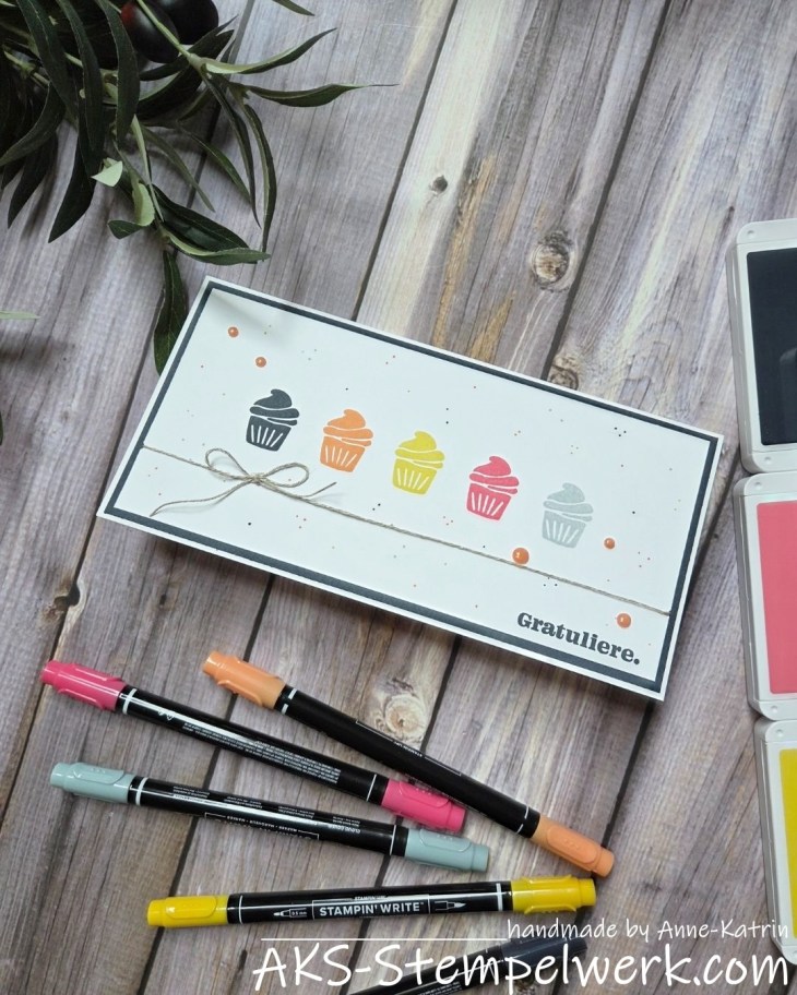 Der süße Muffin stammt aus dem Stempelset „Grüße und Wünsche“.