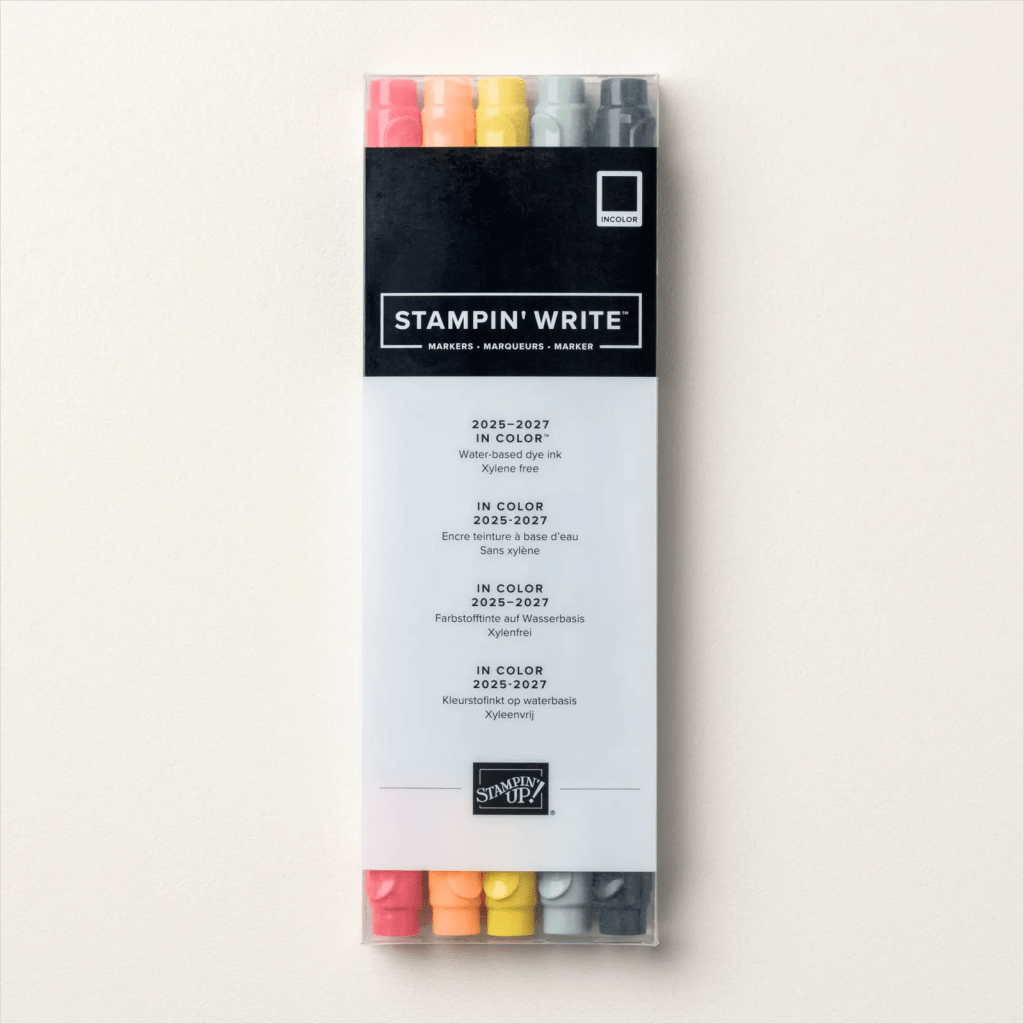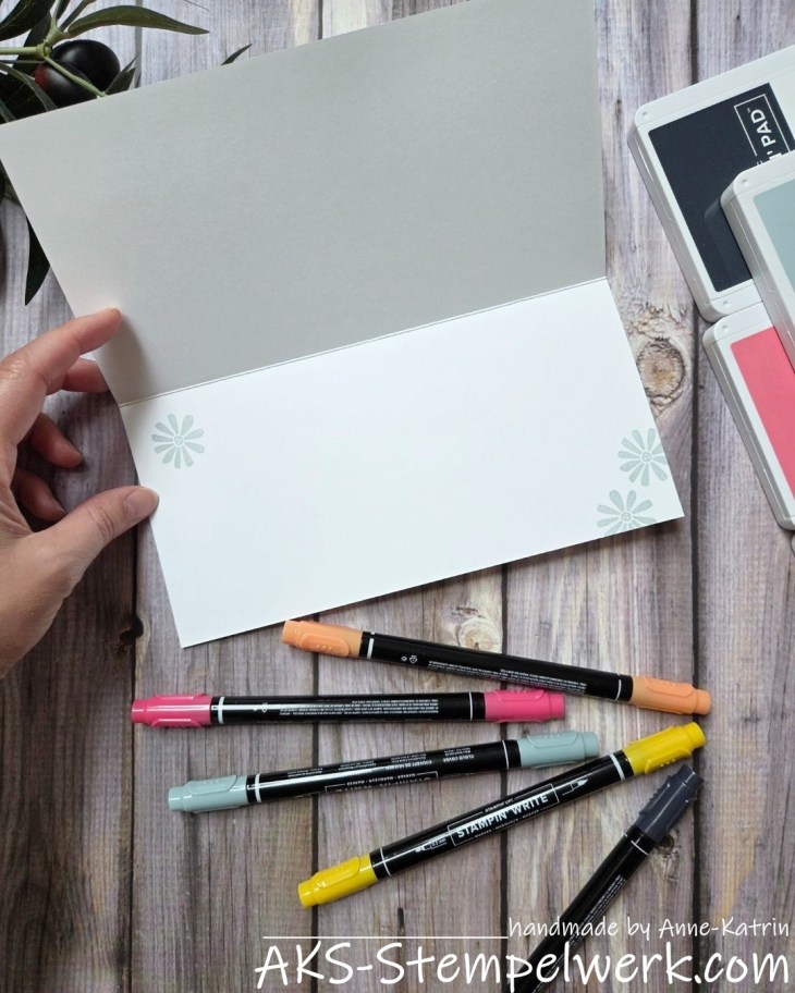 Die Pünktchen für den Hintergrund habe ich mit den Stampin Write Marker in den InColor 2025-2027 gestaltet und für die Farbtupfer auf der Karte die passenden „flachen Perlen-Akzente“ verwendet.