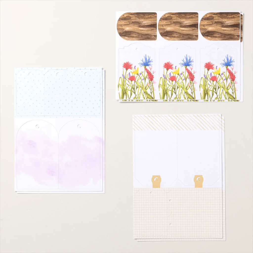 Hier habe ich das Designerpapier „Das Beste im Leben“ gewählt und die Mix and Match – Zierelemente „Anhänger Blumen und Muster“.