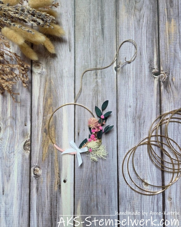 Ich habe eine paar Trockenblumen mit Draht befestigt, ein bißchen Wollgarn drumherum gewickelt und zum Abschluss noch ein kleines Schleifchen eingearbeitet.