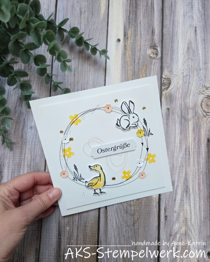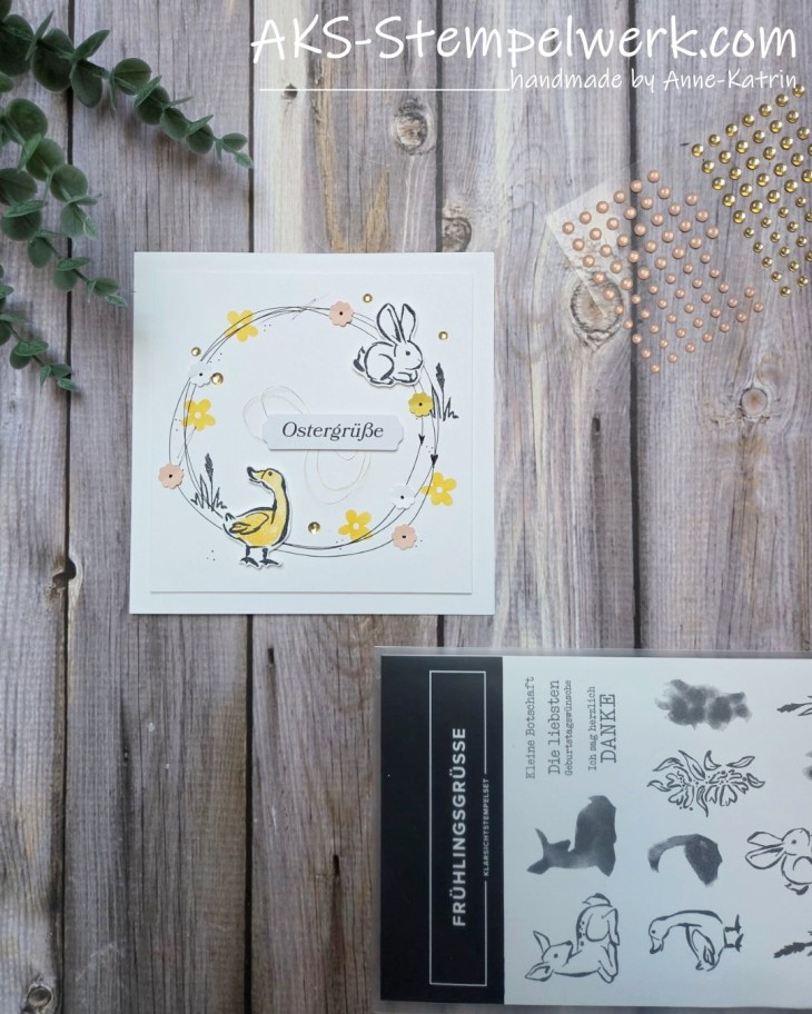 Ich wollte unbedingt das Stempelset „Frühlingsgrüsse“ aus unserer Produkt des Monats-Serie verwenden und habe daraus eine quadratische Karte gewerkelt.