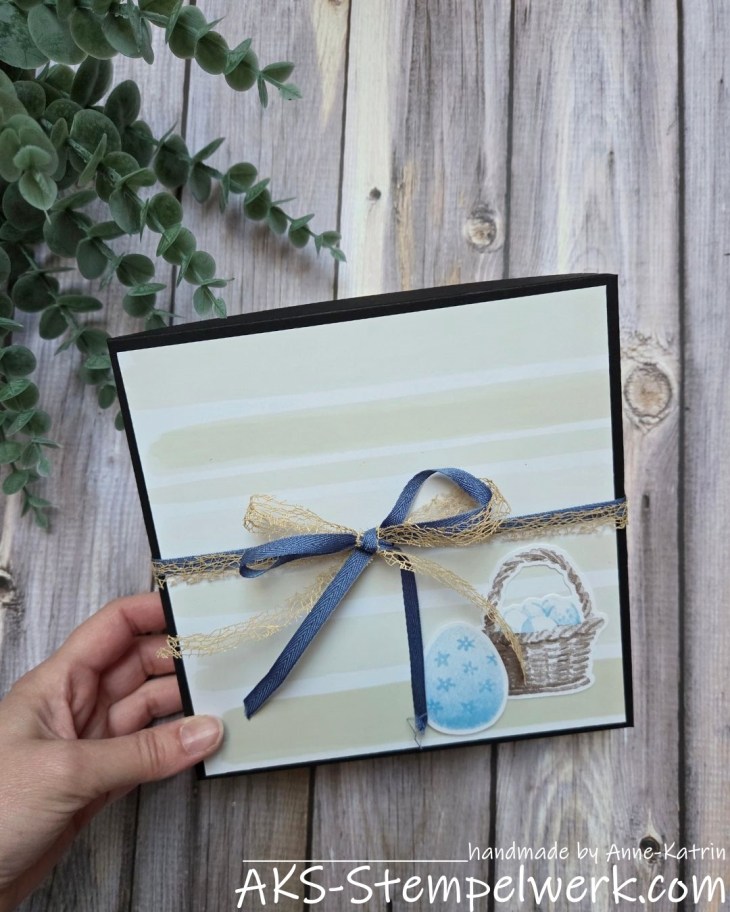 Auch hier sind noch ein paar Motive aus dem Mix and Match – Set obendrauf gekommen, ein paar hübsche Bänder und fertig. Das blaue Band gibt‘ übrigens gerade als Schnäppchen im Doppelpack mit weiß.
