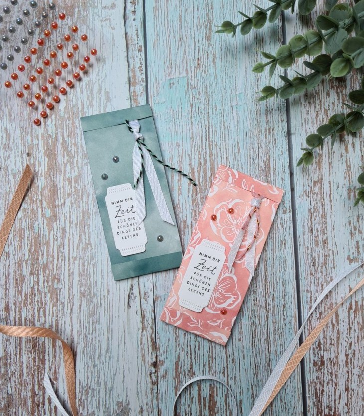 Heute möchte ich Euch ein paar schnelle Goodies präsentieren.Mit einem geprägten Bogen Farbkarton, etwas Geschenkband…