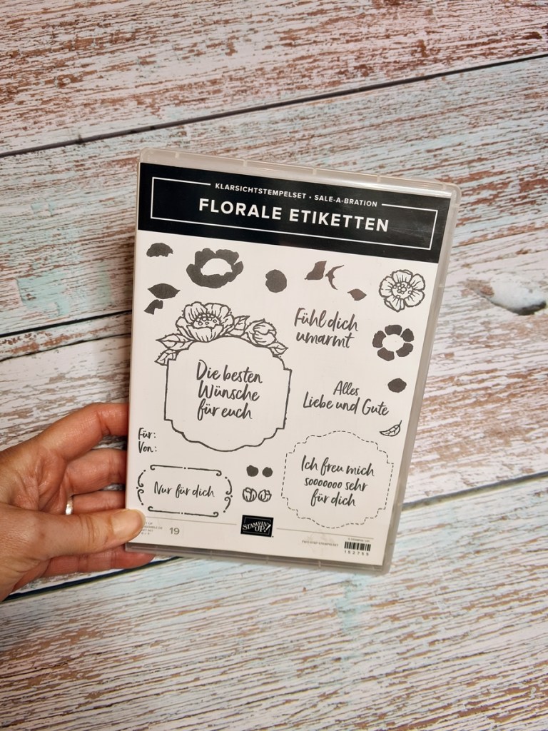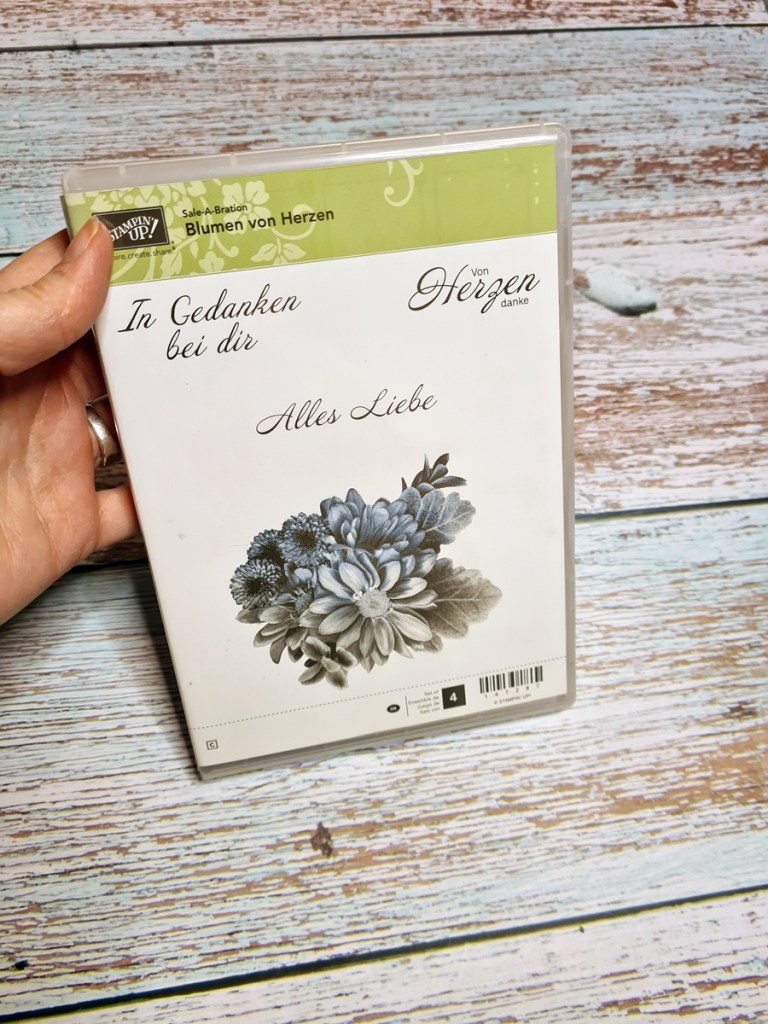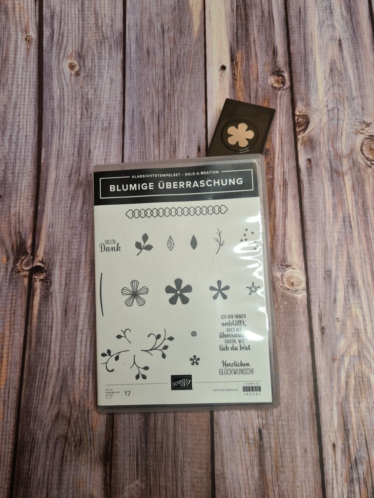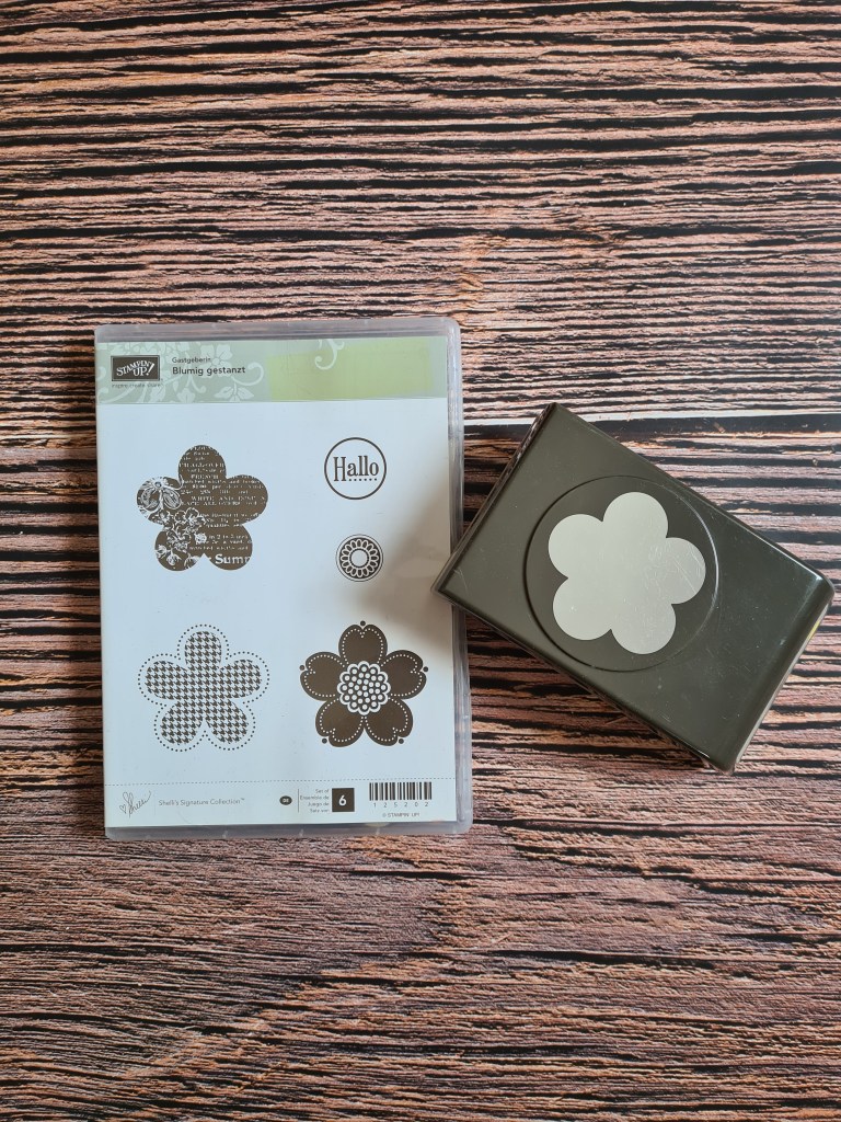 Blumig gestanzt + Handstanze, 28,00 € + Porto (Gastgeberinnenset, kleine Rarität aus meiner eigenen Anfängerzeit; Deckblatt etwas vom Sonnenlicht verfärbt; Gummistempel – alle mit Aufklebern versehen) –> verkauft