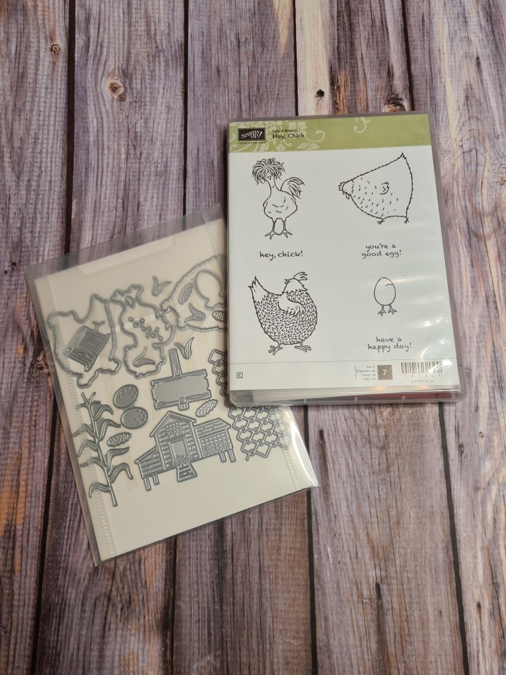 SAB-Stempelset „Hey, Chick“ + Stanzformen „Im Hühnerstall“, 22,00 € + Porto