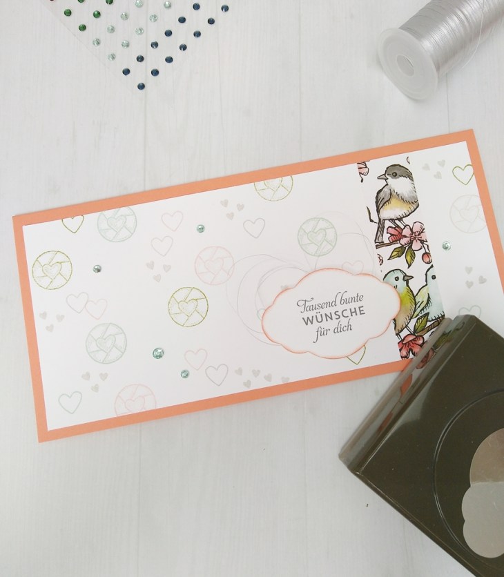 Hier habe ich mal wieder eine farbenfrohe, aber dezente Grußkarte im Längsformat gewerkelt, und zwar…